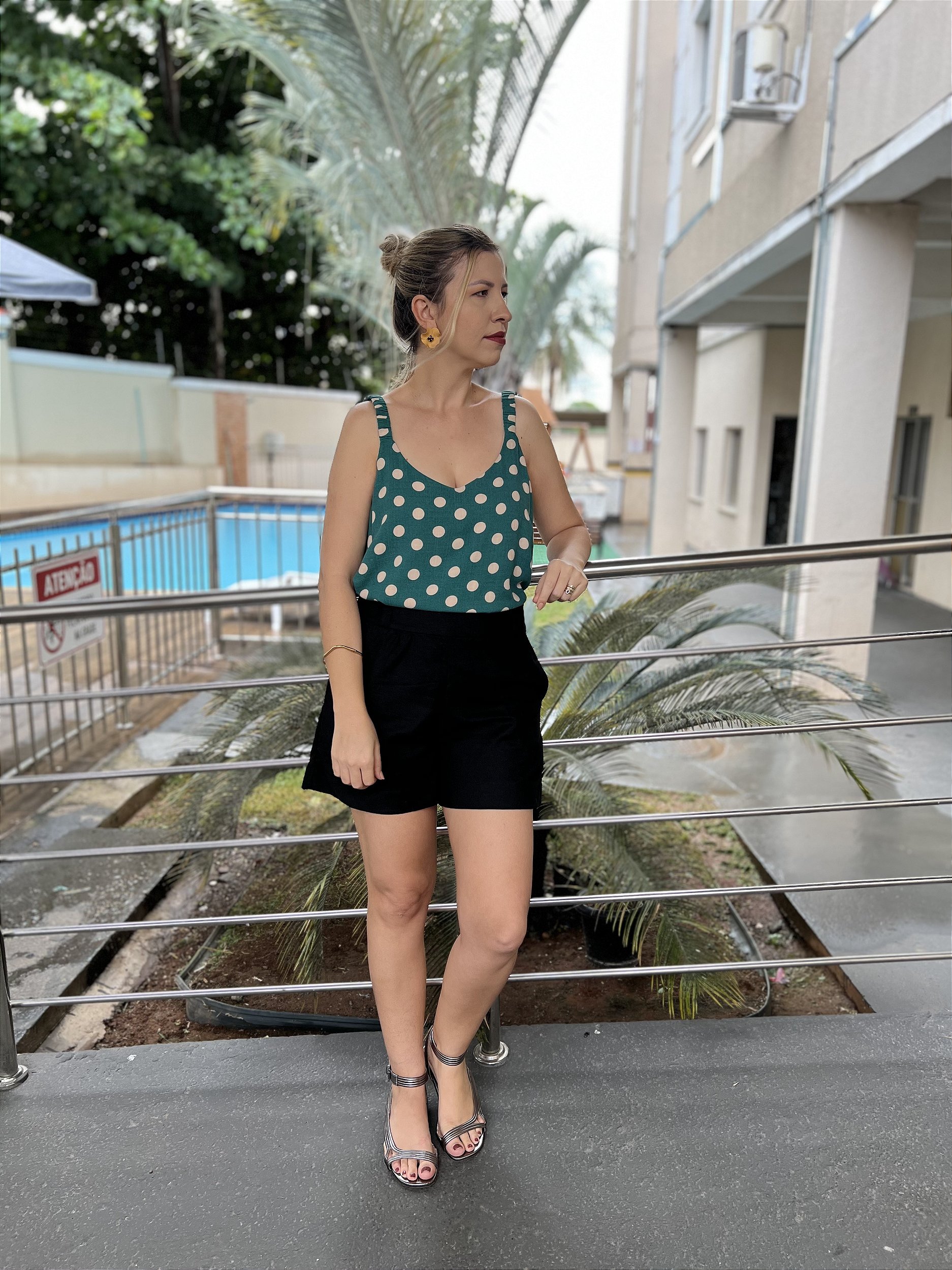 Aline veste Blusa Natália tamanho P