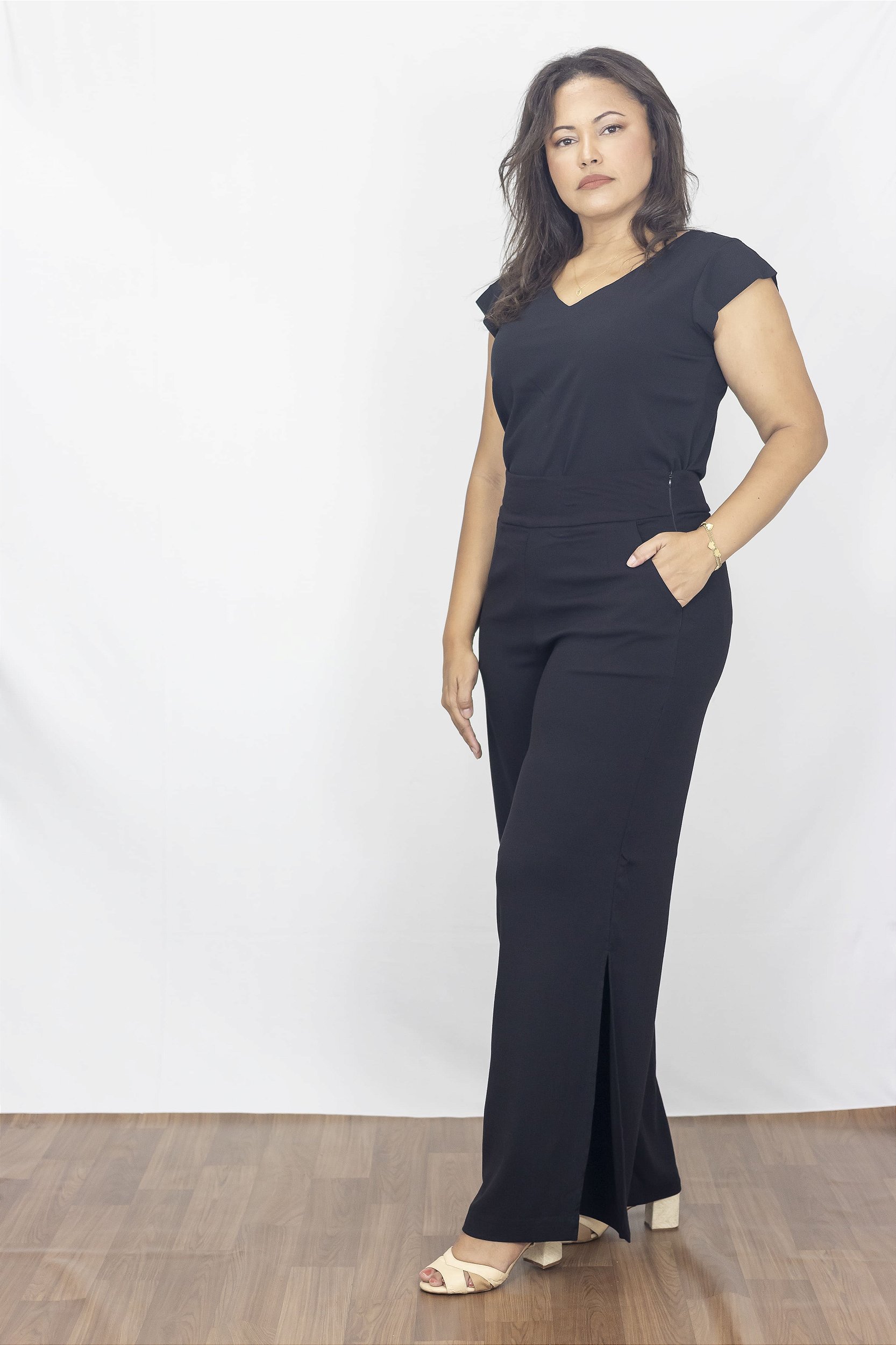 Calça feminina preta com fendas laterais, a Calça Helena é feita em tecido de viscose e elastano, proporcionando conforto e estilo. Com bolsos frontais, fechamento por zíper lateral e pence nas costas para melhor caimento, essa peça é perfeita para mulheres modernas. As fendas laterais não apenas seguem as tendências da moda, mas também adicionam leveza e feminilidade ao seu visual. O cós anatômico garante um caimento perfeito em sua cintura.