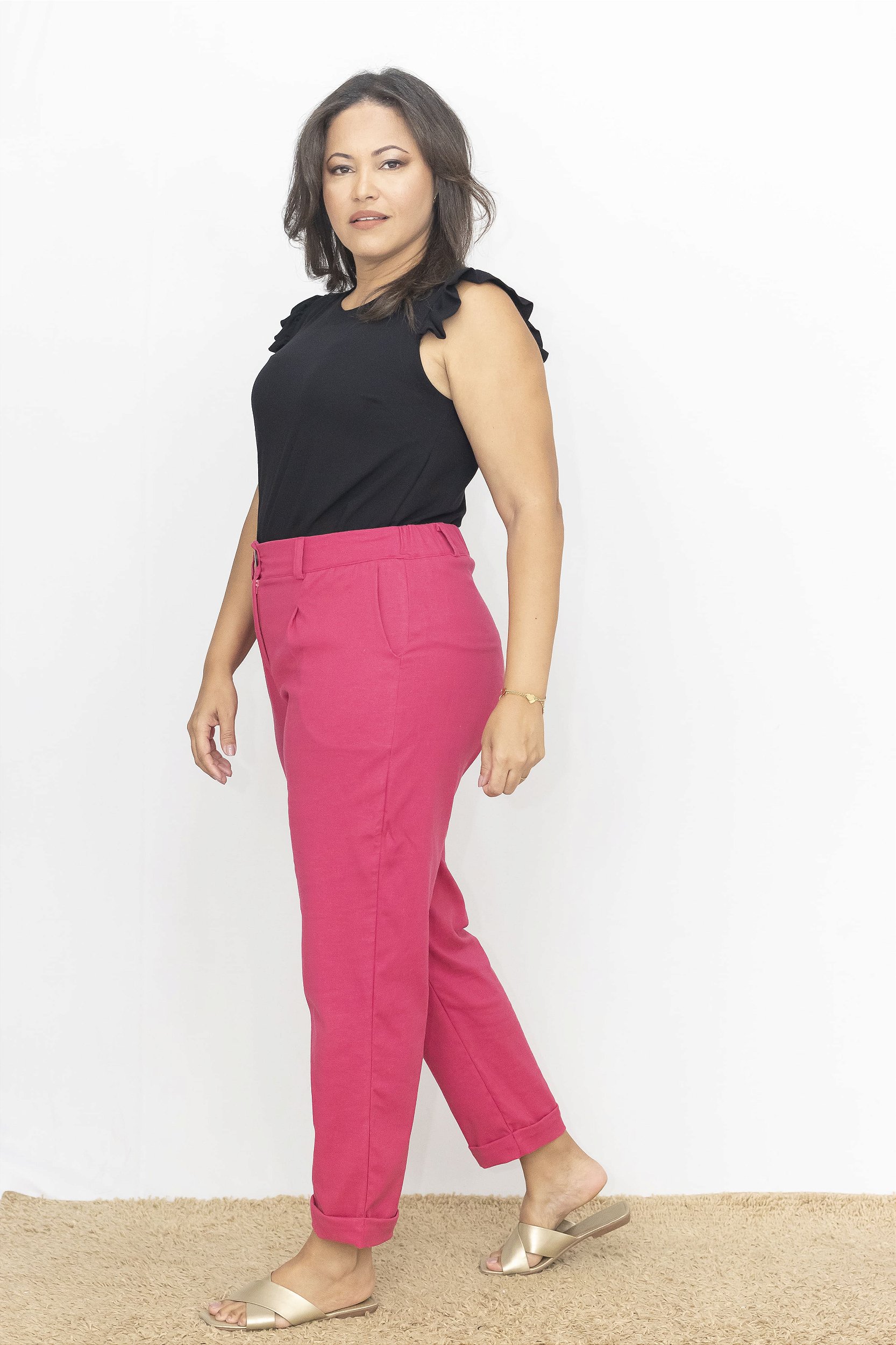 Combinando linho, viscose e elastano, essa peça oferece o melhor dos três mundos: a respirabilidade característica do linho, o caimento da viscose e o conforto do elastano. Sua modelagem é carrot (cenoura), com duas pregas frontais e cintura alta. Ela possui bolsos frontais, cós traseiro com elástico para melhor acomodação e maior conforto.